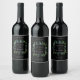 Elegant watercolor greenery, black wedding wine bottle label. Label features modern watercolor botanical foliage frame. Template text lines for date, names and location.