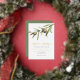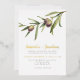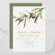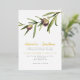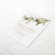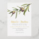 This modern wedding invitation features a simple design with a watercolor olive branch. The bride and groom name and wedding date is in gold typography while the reverse side is coordinated in olive green.