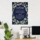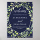 This elegant wedding welcome sign features a modern, silver look geometric frame with a trendy green leaf-filled wreath on a midnight blue background.