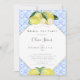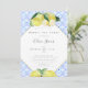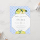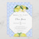A bridal tea party shower invitation featuring yellow lemons, hand drawn in watercolor and colour pencils over a watercolor pattern of blue tiles inspired by the Mediterranean traditions. Personalize it with the name, the date, the time and all the details. Modern calligraphy for the bride's name and a diamond shaped background.