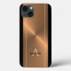 Protect your phone in style with this Modern Bronze Metallic Black Personalized Men's iPhone 13 Case. This design is a masculine faux metallic bronze gold stripe on black background. It is personalized with name in bold black minimalist lettering and your initial in light beige on the centre. Makes a great gift idea for him!