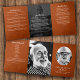 This refined celebration of life memorial card features a rich rust brown leather background paired with elegant white script and serif fonts, offering a warm and heartfelt tone. The front panel includes a circular photo frame and beautifully typeset tribute text, providing a dignified introduction to the life being remembered. The interior design is thoughtfully organized to guide the order of service, include acknowledgments, and feature a touching message or poem, or any other text of your choice, all enhanced by black and white photo panels. This template offers a balance of sophistication and sentiment, making it ideal for memorial services or celebration of life events. The overall aesthetic evokes warmth, gratitude, and remembrance, helping families honour their loved one with grace and meaning.
