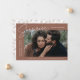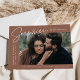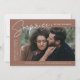 Share the news of your surprise engagement with these elegant photo engagement announcements. The design features the phrase "Surprise, we got engaged!" in a trendy white script and modern lettering on a brown clay-coloured background. Your engagement photo is featured in the centre-right part of the design with your names and engagement date displayed on the left. Personalize the surprise engagement announcement by adding additional details below such as wedding city/state, wedding website, etc. The announcement reverses to display a brown clay-coloured foliage pattern on a white background.
