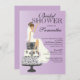 Start off your elegant bridal shower off right with our trendy Brunette bride bridal shower invitation featuring a classy Blonde bride sitting on a stylish damask 3 tier wedding cake set on a purple background. Just customize our invitation with your wedding shower information and you're all set to go. ©JW Illustrations