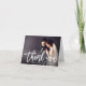 A modern and bold wedding thank you card featuring a full-bleed couple photo with a large brush-style white calligraphy "thank you" script sweeping dramatically across the image. The couple's names and wedding date are fully editable for a personal touch. The casual yet bold brush script gives this card a contemporary, editorial feel. The folded card interior is available for a handwritten note or custom printed message.