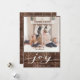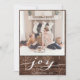 Send customizable and personalized holiday greetings to friends, colleagues and family in simple, chic, elegant and modern photo design festive, natural minimalist style cards! A beautiful calligraphy of " joy " frames on bottom of your photo in front. Below the calligraphy features your custom greeting message from your family name in modern typography. Reverse to reveal a beautiful golden brown trees on rustic dark brown wood background.
