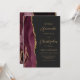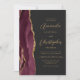 The left-hand edge of this elegant modern wedding invitation features a burgundy watercolor agate border trimmed with faux gold glitter. The customizable text combines gold-coloured script and sans serif fonts on a slate black background. The reverse side features a matching burgundy and gold agate design.