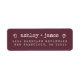 Mariage moderne, chic et simple étiquette d'adresse de retour avec vos noms dans la typographie moderne blanche sur un arrière - plan bordeaux avec une touche de coeurs dessinés à la main. Ajoutez simplement vos noms et votre adresse. Conçu exclusivement pour vous par Happy Dolphin Studio.