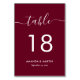 Minimalist, yet elegant burgundy wedding table number card featuring a modern script font. Matching items available.