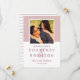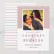 Modern wedding save the date announcement cards feature a square engagement photo framed in rose pink with a simple and minimalist style monogram of the bride and groom names with an elegant script ampersand. Personalize the save the date wording with the wedding date and location. The back of the card includes a sleek pattern of thin burgundy red and white horizontal stripes.