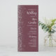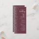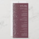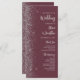 The left-hand edge of this elegant modern wedding program features a silver faux glitter design. The customizable text combines silver grey handwriting script and sans serif font on a dark burgundy background.