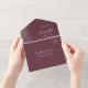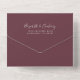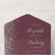 The left-hand edge of this elegant modern all-in-one wedding invitation and RSVP features a silver faux glitter border. The customizable text combines silver grey whimsical handwriting, copperplate and italic fonts on a burgundy background. The return address appears on the outside flap and the reverse side of the detachable RSVP card in silver grey text on solid burgundy.