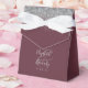 The front flap of this elegant modern wedding favour box features a silver faux glitter border. The customizable text combines silver grey handwriting and copperplate fonts over a large ampersand on a dark burgundy background.
