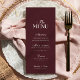 Elevate your reception tablescape with this elegant Modern Burgundy Wedding Menu Invitation. Featuring a minimalist layout accented with rich burgundy tones, this design effortlessly blends modern sophistication with timeless romance. Clean typography and a contemporary format create a sleek and elegant presentation that perfectly complements your wedding theme.