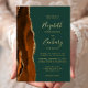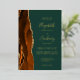 The left-hand edge of this elegant modern wedding invitation features a burnt orange watercolor agate border trimmed with faux gold glitter. The customizable text combines handwriting, copperplate and italic fonts in real gold foil on an emerald green background. The reverse side features a matching burnt orange and gold agate design.