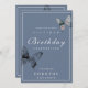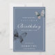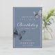 A beautiful modern adult birthday invitation in slate blue with hand-painted butterflies containing a floral rose pattern. Customizable for any birthday milestone