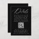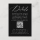 Simplify wedding planning with this QR code wedding details enclosure card, featuring "Details" in elegant white calligraphy on a sleek black background. Perfect for weddings in any season and suited for both formal and casual celebrations, this stylish and modern design allows couples to include essential wedding information such as reception details, hotel accommodations, and their wedding website in bold white lettering. The integrated QR code provides a convenient way for guests to access the couple's wedding website for additional information at their fingertips. Combining functionality with timeless elegance, this enclosure card is an ideal addition to your wedding suite.