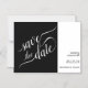 These save the date cards are simple, modern, minimalist, and elegant. They feature a contemporary two pane design. The black panel on the left has script calligraphy reading "save the date." The panel on the right has your names, the wedding date, and location in a trendy right justified layout. Beautiful way to help your friends and family remember your upcoming special day.