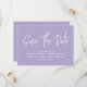 Modern calligraphy save the date with a digital lavender background and a scannable QR code for a website or contact information on the back.