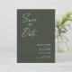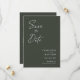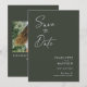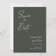 Modern, minimalist and elegant "Save The Date" wedding engagement photo cards. This custom design featuring elements of modern text with a unique calligraphy ink script. The couples photo highlights the back of the card. Colours are white writing on new olive green or easily customize the base colour as needed.