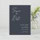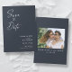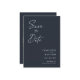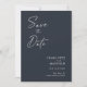 Modern, minimalist and elegant "Save The Date" wedding engagement photo cards. This custom design featuring elements of modern text with a unique calligraphy ink script. The couples photo highlights the back of the card. Colours are white writing on slate blue or easily customize the base colour as needed.