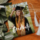 This graduation announcement features a large, full front photo with modern calligraphy overlay and graduation party details on the back. The back elements can be removed by clicking the button to edit further.