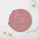 Modern classy calligraphy circle save the date card with minimal text on the front on a soft dusty rose blush pink background and your image of choice on the back. Customize this round save the date card it with your own photo, names, wedding date and location and make it uniquely your own. All colours (text and background) are customizeable too.