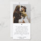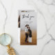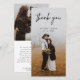 This wedding thank you photo-card features a photo on the back and front. The thank you calligraphy heading is in a black modern mono-line style. A second couples photo appears on the back along with an editable message.