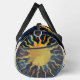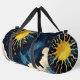Encircling the sun is an array of stars and celestial bodies, meticulously detailed in shades of white, grey, and yellow. These stars create a harmonious celestial scene, adding depth and a touch of magic to the duffel bag. The intricate placement of each star enhances the overall aesthetic, making this bag a standout piece for those fascinated by the wonders of the universe.