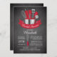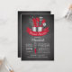 Modern stock the kitchen bridal shower invitation featuring a mixing bowl filled with kitchen tools accented with a modern red banner and set on a contemporary black chalkboard background. Visit our shop to view our stylish utensil wedding shower invite in a variety of popular wedding colours.