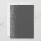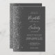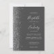 The left-hand edge of this elegant modern wedding invitation features a silver faux glitter design. The customizable text combines silver grey handwriting, copperplate and italic fonts on a charcoal grey background. The reverse side features a matching grey and silver glitter design.