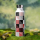 This water bottle features a modern pattern of checkers with hand-drawn lines in black, red, grey and white.