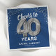 Elegant fortieth birthday party napkins featuring a stylish navy blue background that can be changed to any colour, silver sparkly glitter, the saying "cheers to 40 years" using forty silver hellium balloons, their name, and the date of the celebration.