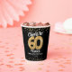 Elegant sixtieth birthday party cups featuring a stylish black background that can be changed to any colour, gold sparkly glitter, that saying "cheers to 60 years" using sixty gold hellium balloons, their name, and the date of the celebration.