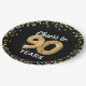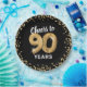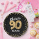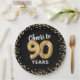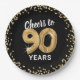 Elegant ninetieth birthday party paper plates featuring a stylish black background that can be changed to any colour, gold sparkly glitter, and the saying "cheers to 90 years" using ninety gold hellium balloons.