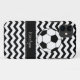 Modern and trendy chevron stripes iPhone case features black and white chevron stripes, a soccer ball and a black accent border frame for your name, initial or other text. Show your personality with this fun and trendy iPhone case. Makes a great gift for all occasions. Click the "Customize it!" button to change the text size, text colour, font style and more!