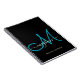 Modern, trendy girly black and teal custom personalized monogrammed spiral notebook. This simple elegant design features white cursive hand lettering name with swashes in white and a huge hand-writing monogram script in dark teal blue, turquoise or teal green colour on black background. This feminine, pretty notebook is a perfect gift idea for business, professional, school, birthday party, wedding and any party or occasion for someone that like girly and modern styles. If you need help or matching item please contact to designer.