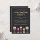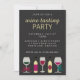 This modern, stylish wine tasting party invitation features a black background and gold and silver coloured text. The bottom edge of the invitation is lined with wine bottles and glasses of red, green, and pink wine. We have used art from http://revidevi.etsy.com .