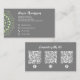 This great professional business card features modern professional elegant chic minimal, simple trendy green grey business with QR code social media website, office corporate trendy stylish design, contemporary elegant minimalist design, connect with me online, phone website cell email icon, professional minimalist girly feminine, circle shapes floral sophisticated, fun whimsical geometrical style.