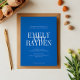 The wedding invitation features a minimalist design with an sapphire blue background and a clean, symmetrical layout. It uses elegant serif fonts, with the couple's names prominently displayed in large, overlapping text for a bold and modern touch. The remaining details are arranged in a smaller, clear font, maintaining simplicity and sophistication, blending contemporary and traditional aesthetics.