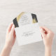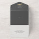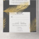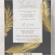 An improved version of the tri-fold invitation now with a tear away rsvp section. Featuring a modern design with tropical gold palm leaves over a dark grey (charcoal) combined with an elegant calligraphy typography, for a chic look. This all-in-one sustainable invitation would save you money, no need to include RSVP envelopes, your guests will tear away the last panel and mail it back to you as a postcard.