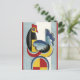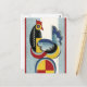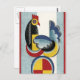 An Art Deco abstract version of a chicken sitting on an egg. Colourful in red, blue and yellow