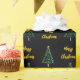Simple and modern Christmas gift wrapping paper with a cute green christmas tree pattern on black with gold Merry Christmas typography.