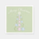 This paper napkin design features three non-traditional colour Christmas ornaments in pastel green, pink, and blue with white stars. The ornaments are stacked and staggered in size to form a Christmas tree shape over a green background. Leave the "Merry Christmas" template text as it is, personalize it or remove it completely.