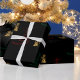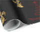 A lovely, very contemporary black Christmas wrapping paper featuring golden angels, praying, in between red and green Christmas trees made of stars on a black background.