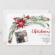 Modern Christmas wreath illustration snow photo with modern red, green and white holly berries, mistletoe, poinsettia, pine tree branches, add your family photo with an elegant brush script font.