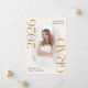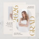 Announce the graduate's big achievement in style with this modern photo graduation announcement. The trendy design features "Class of 2025 Grad" in bold gold lettering with subtle script accents with a solid cream background. The graduate's vertical photo is displayed inside an oblong frame at the centre of the announcement. Personalize the front of the cream and gold graduation announcement with the graduate's name and school. The announcement reverses to display an additional photo displayed inside of a square frame with your custom text shown below. The stylish graduation announcement is perfect for high school and college graduates.