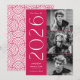 Stylish graduation announcement featuring the graduate's three photos located to the right of the design in a vertical layout. "2025" is displayed in white, modern art deco lettering with a magenta background. Personalize the modern photo graduation announcement by adding the graduate's name and school name. The design reverses to display a magenta and white geometric swirl background. Perfect for both high school and college graduations!