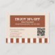 Treat your customers to sweet savings with this beautifully designed Modern Classic Brown Beige Bakery discount card! Featuring a rich brown background accented with delightful beige doodle illustrations of baked goods—like bread, cupcakes, and pastries—this card exudes warmth and creativity, perfectly reflecting your bakery’s charm. Ideal for special promotions, seasonal offers, or customer appreciation events, the discount card is fully customizable with your bakery’s name, contact information, and discount details. Its rustic yet playful design makes it an irresistible keepsake for customers, encouraging repeat visits and boosting loyalty. Delight your customers and make every purchase sweeter with this thoughtfully designed discount card!