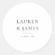 This elegant minimalist round wedding sticker features the couple’s names in refined black typography on a clean white background. The simple and timeless layout creates a sophisticated accent for wedding favors, envelopes, or gift packaging. Personalize with your names and date to complete your classic wedding look. Perfect for modern, traditional, or monochrome wedding themes.